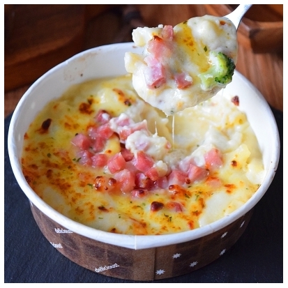●原材料名:野菜(玉ねぎ(国産)、ブロッコリー(エクアドル産))、牛乳(生乳(国産))、ショルダーベーコン、マカロニ、ナチュラルチーズ、小麦粉、乳製品、マーガリン、生クリーム、ブイヨン、ビーフエキス、食塩、砂糖、香辛料/増粘剤(加工でん粉、増粘多糖類)、調味料(アミノ酸等)、リン酸塩(Na)、酸化防止剤(ビタミンC)、香料、発色剤(亜硝酸Na)、カロチノイド色素、(一部に小麦・乳成分・牛肉・大豆・鶏肉・豚肉を含む)