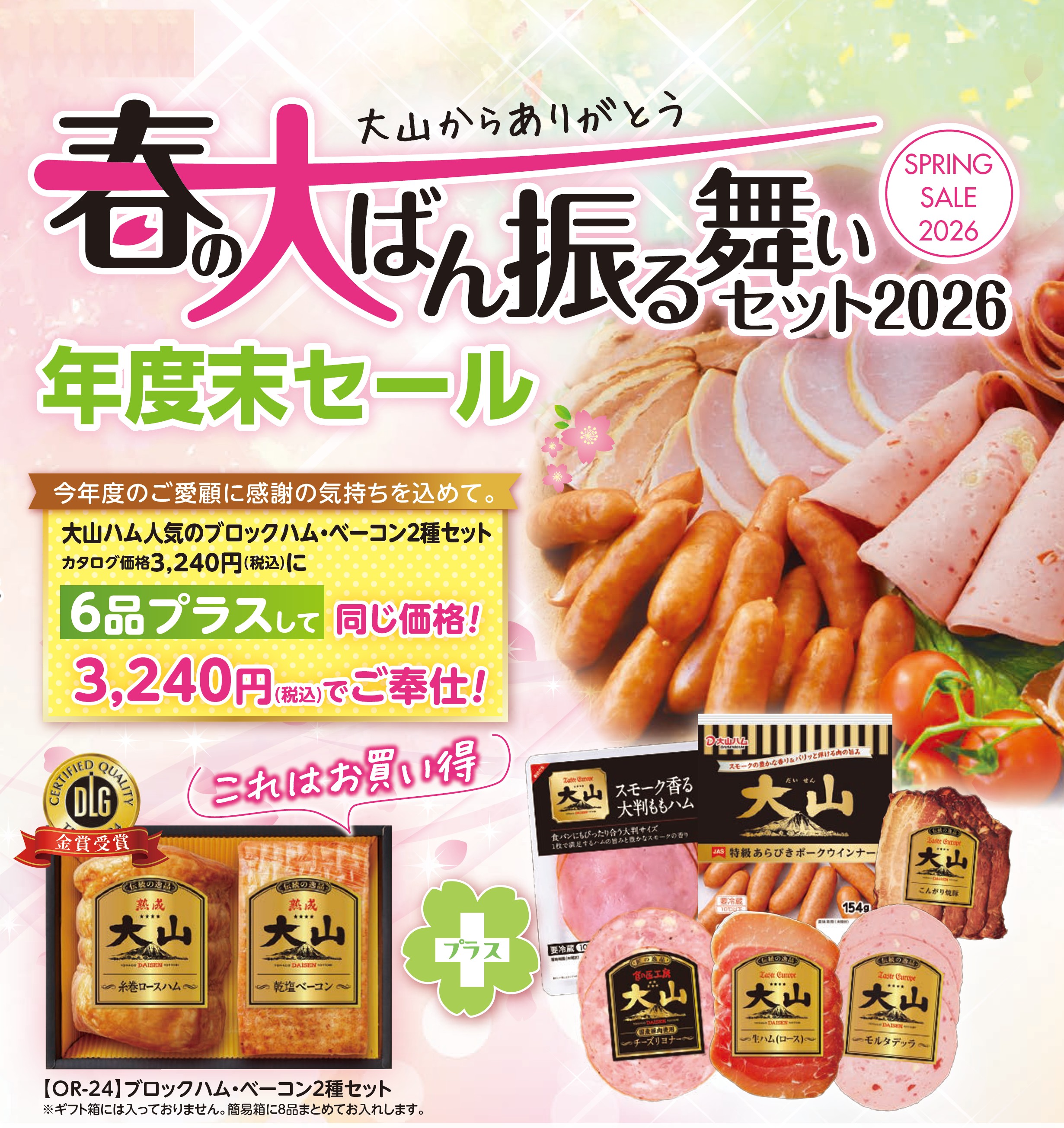 今年度のご愛顧に感謝の気持ちをこめて、ブロックハム・ベーコン2種セット(OR-24)に、6品プラスして同じ価格3,240円(税込み)で販売いたします!